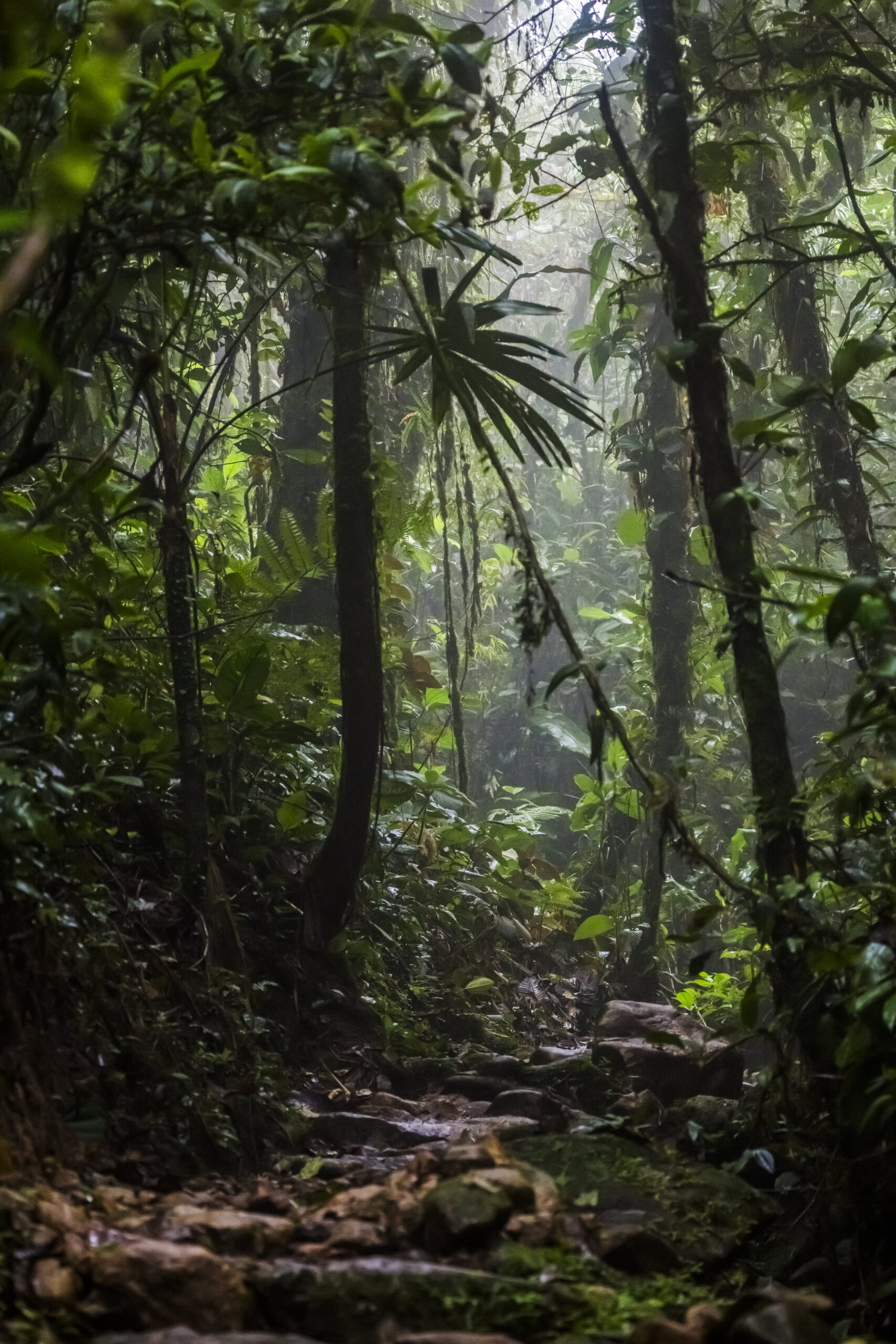 De volgende ochtend maken we zelf ons ontbijt, we mogen de keuken bij het appartement gebruiken. Gooijert bakt vakkundig een ei en worstjes. De planning van vandaag is om de cerra gaital trail te doen. Daar zou je de meeste kans op wildlife hebben volgens andere bloggers. We rijden een flink stuk omhoog de berg op, dus vragen ons wel af of we goed gaan, maar dan komen we toch echt bij het beginpunt. In een boek moeten we onze namen en dergelijke noteren. Deze trail kost 5 usd, maar cash of via pinpas betalen kan niet. Daarom moeten we een foto maken van een link en dan kunnen we later online betalen. Het eerste wat we zien is een mini kikkertje, daarna zien we prachtige kleine fel oranje bloedbessen en een heel grote calicobloem hoog in de boom. De route in de nevel is prachtig, alles is begroeit met mos en varens.