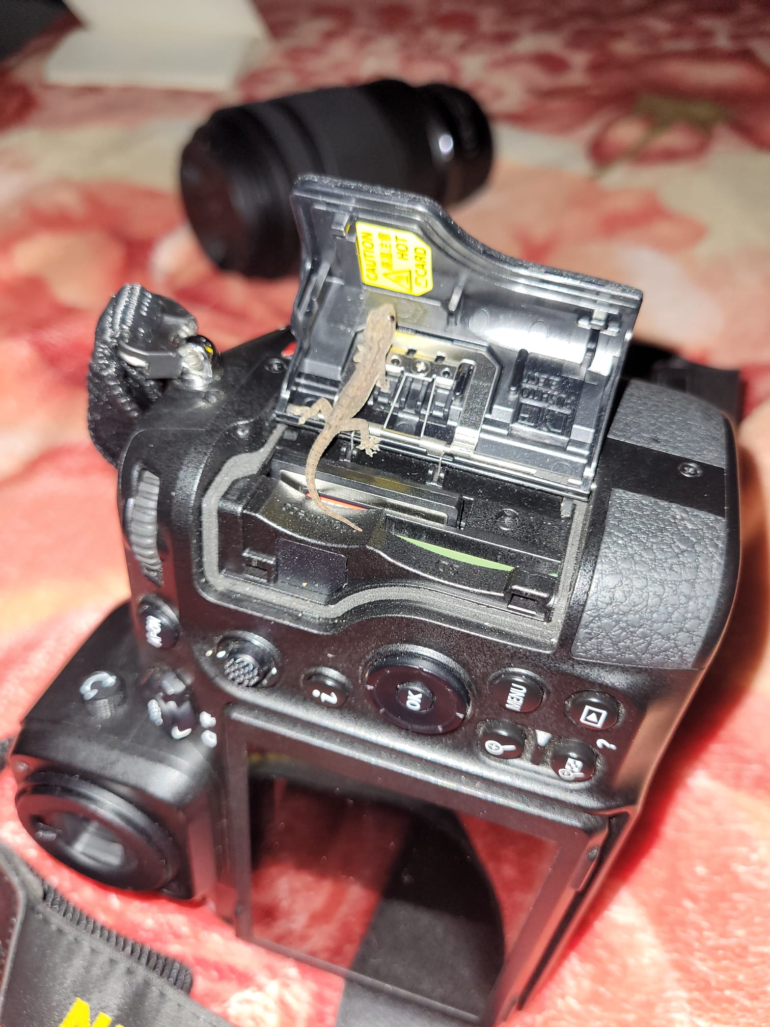 De stroom valt enige tijd uit. Als ik de geheugenkaart leeg op de laptop en ik de kaart weer terug wil doen kijken 2 kleine kraaloogjes mij aan. Er zit een gekko op mijn camera, precies daar waar de geheugenkaartsleuven zitten, haha.