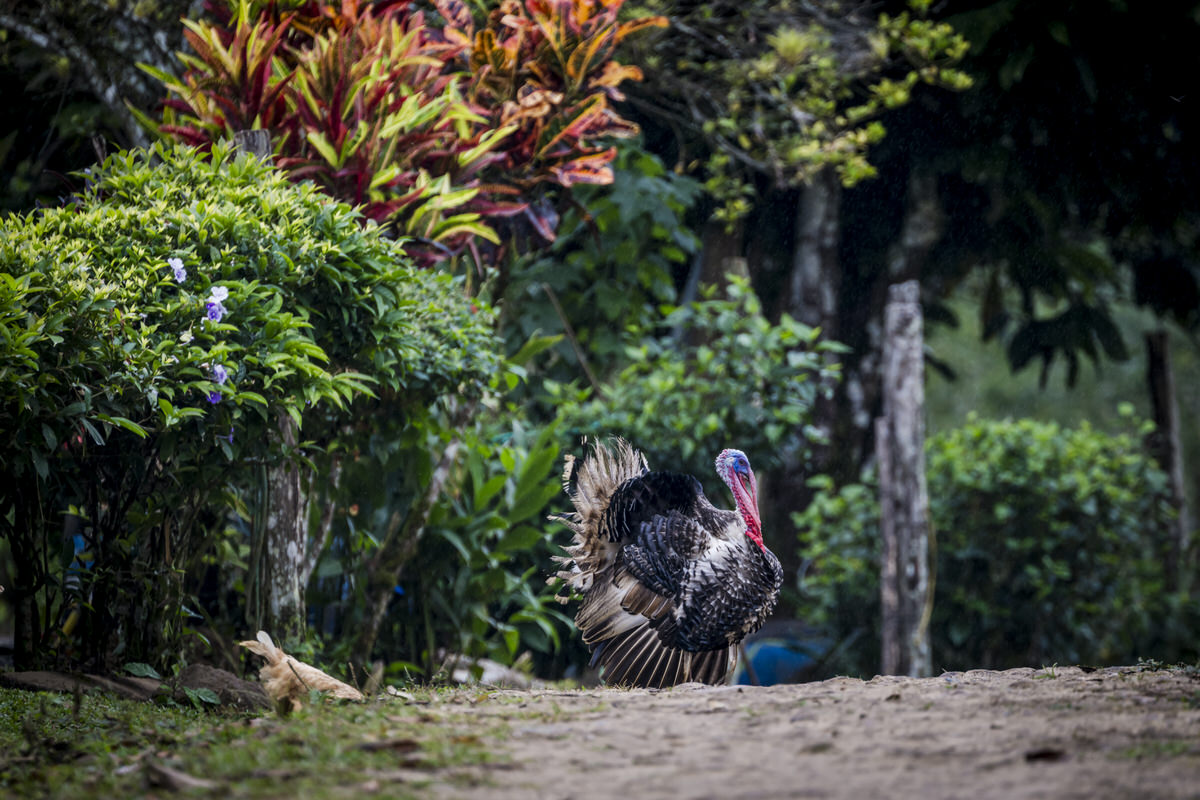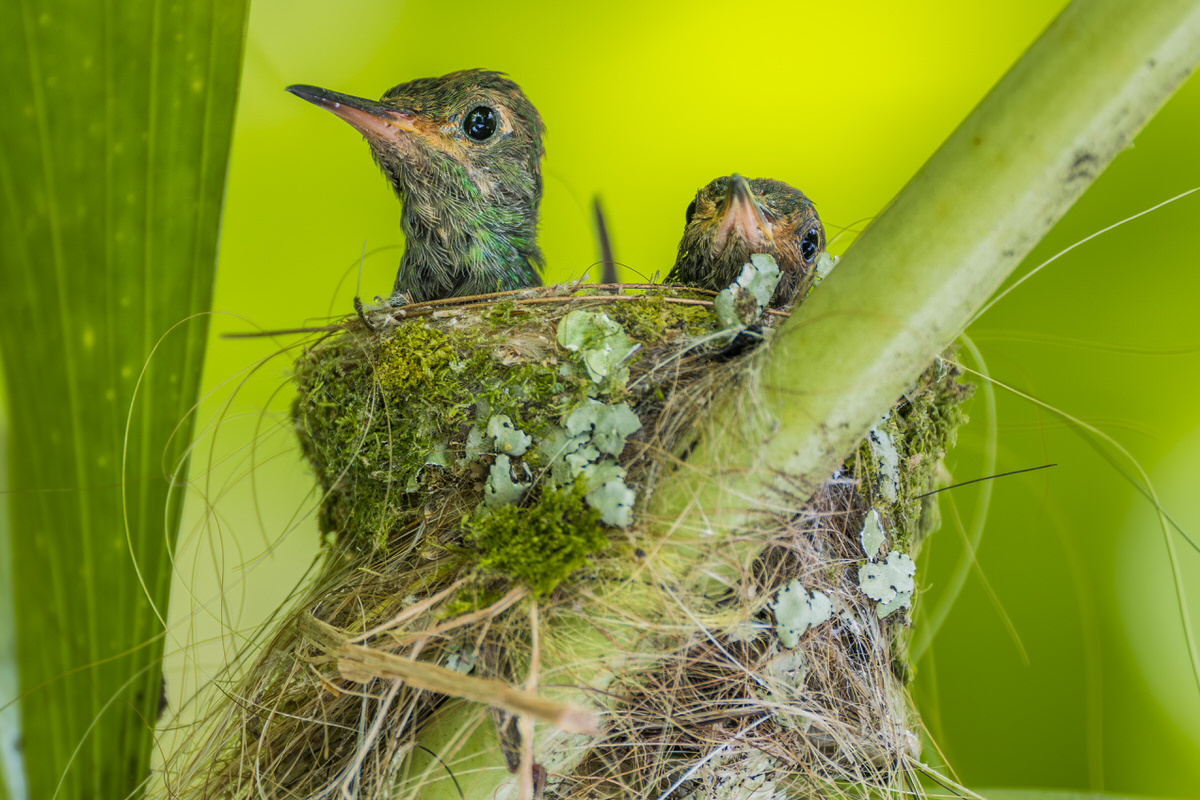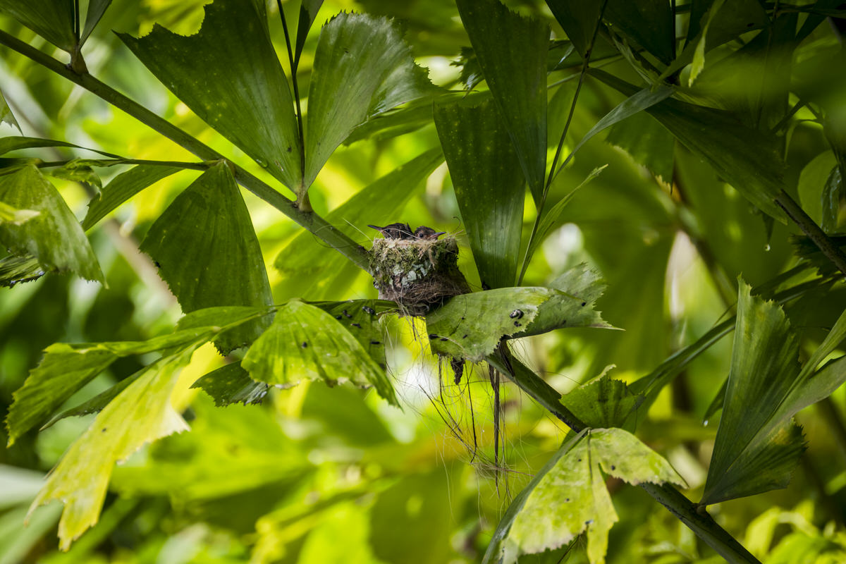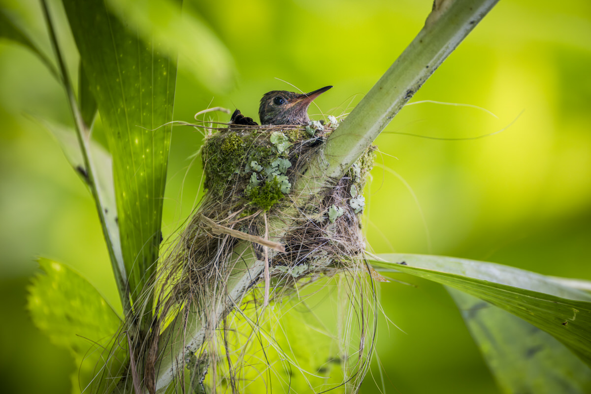 Dan maar naar het appartementje en een biertje drinken. De kolibrietjes in hun nestje zijn klaarwakker, dus daar maak ik nog een foto van. We zitten net op ons overdekte terrasje en begint flink te hozen. En dat blijft zo, wat een timing!