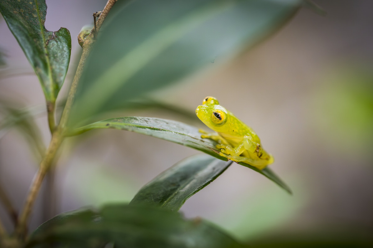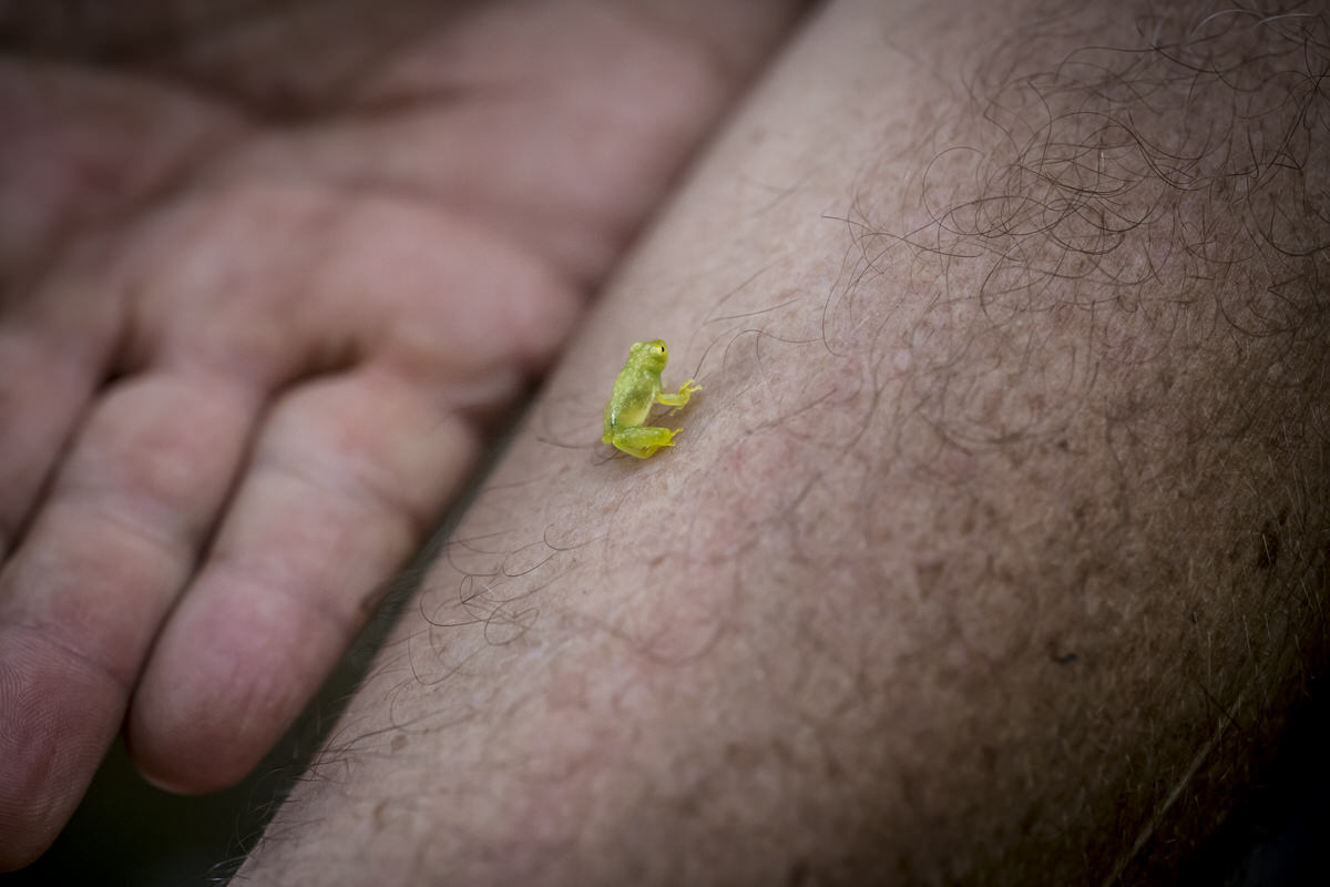 Inmiddels zijn we weer terug in Santa Fé en gaan we op zoek naar kikkers. Daar waar Ricardo de eigenaar van het hostel een nieuw hostel aan het bouwen in moeten we naar beneden lopen richting de rivier. Het is behoorlijk stijl. Daar zien we wel wat kleine kikkers springen maar vooral bruin. Gooijert plukt weer wat mandarijnen uit de boom die we opeten en we nemen een heel grote citrusvrucht mee, morgen maar eens uitproberen hoe die smaakt. Uiteindelijk vindt zijn vrouw een glaskikkertje en Gooijert vindt er ook 1. Dat kikkertje springt op Gooijert zijn arm en dan zie je hoe enorm klein ze zijn. De groen zwarte pijlgifkikker die we vooral zouden moeten zien vinden we helaas niet.