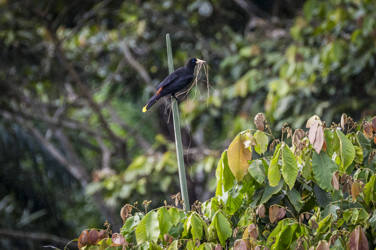 Kuiforopendola met nestmateriaal in zijn snavel.