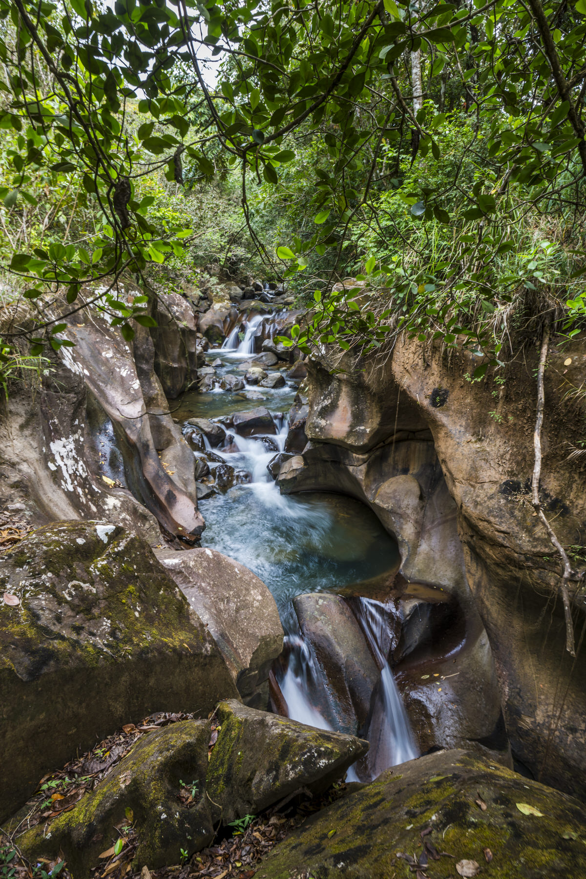 We denken een waterval te horen, dus we slaan weer een zijweggetje in en geloof het of niet…….. we vinden de waterval. Heel bijzonder is deze waterval met de uitgesleten en gepolijste rotswanden.