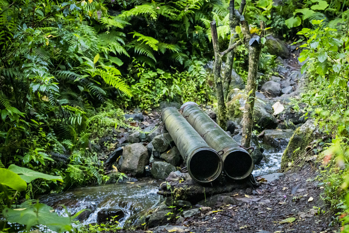 Halverwege de trail hoor ik gesnuif en gegrom in de bosjes dus ik loop terug naar Gooijert. Ik zeg ik ben bang Gooijert, er zit iets daar in de struiken en we zien de varens bewegen. Gooijert loopt naar het geluid en de beweging toe en schiet in de lach. Het is een ontluchter van de waterleiding die dat geluid maakt en de varens doet bewegen. Want ja je loopt hier langs de pijpleiding van het water wat opgevangen wordt en waardoor wij kunnen douchen enzo. Aan het einde van de deze trail is een waterval, die is metershoog, maar er valt niet heel veel water.