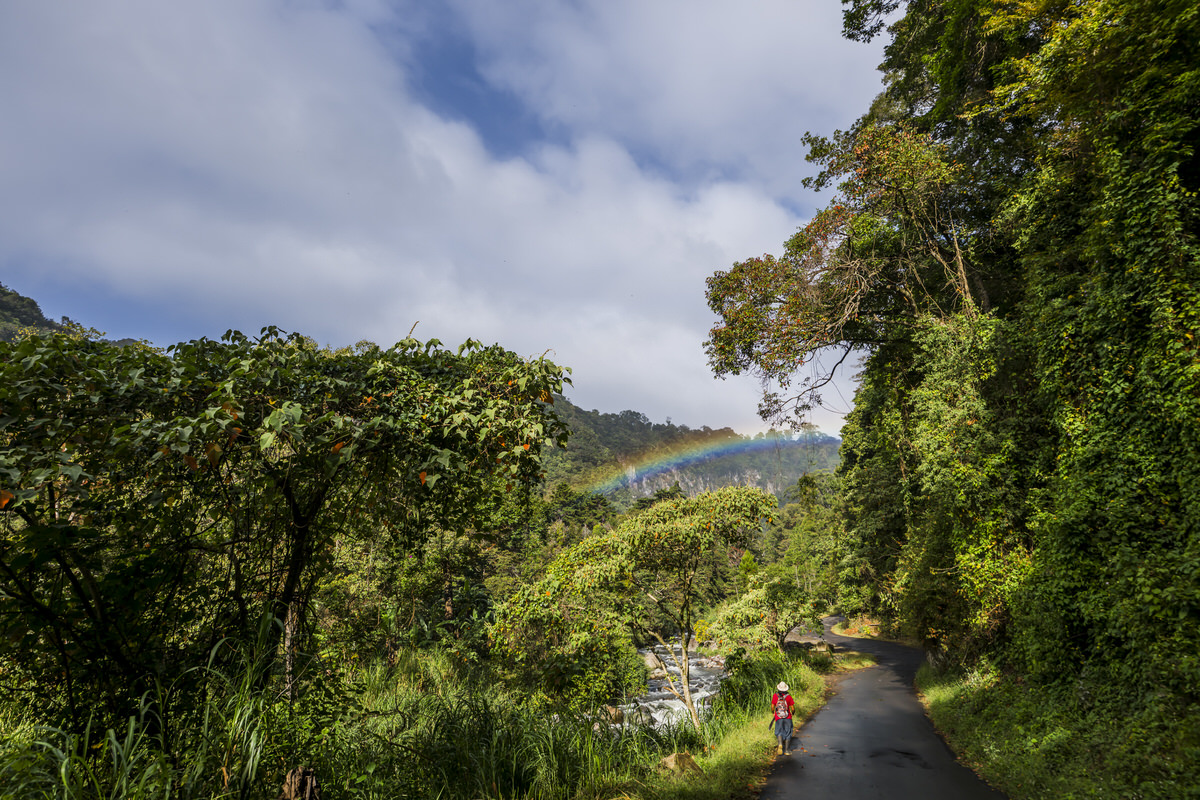 We moeten nodig boodschappen doen dus we zoeken naar een supermercado, het is onwijs druk in het centrum van Boquete omdat er iets van een festival is ofzo. En dan vinden we een grote supermarkt. We rijden naar de Quetzal trail, even kijken waar dat is en we komen ook de ingang tegen van de Pipeline trail. Het begint te regenen en de zon schijnt ook volop, daardoor zien we een waanzinnig mooie en fel gekleurde regenboog.