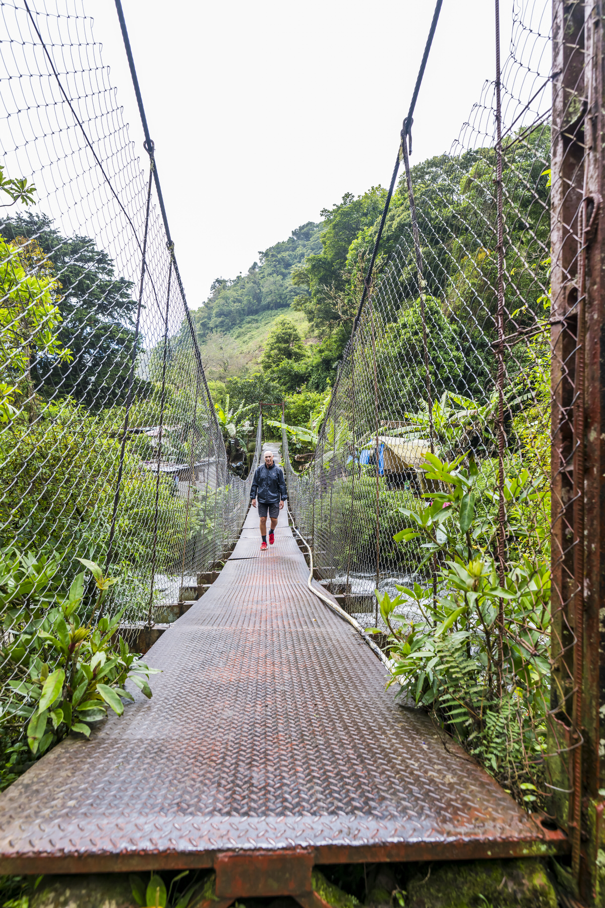 Waze navigeert perfect naar de ingang van de trail, alleen blokkeert een grondboormachine de weg. De auto parkeren we daarom een stukje terug en dan lopen we naar de ingang. Eerst moet je een flink stuk omhoog lopen over rotsen en keien en over een hangbrug, dan kom je uit bij een hokje waar je moet betalen.
