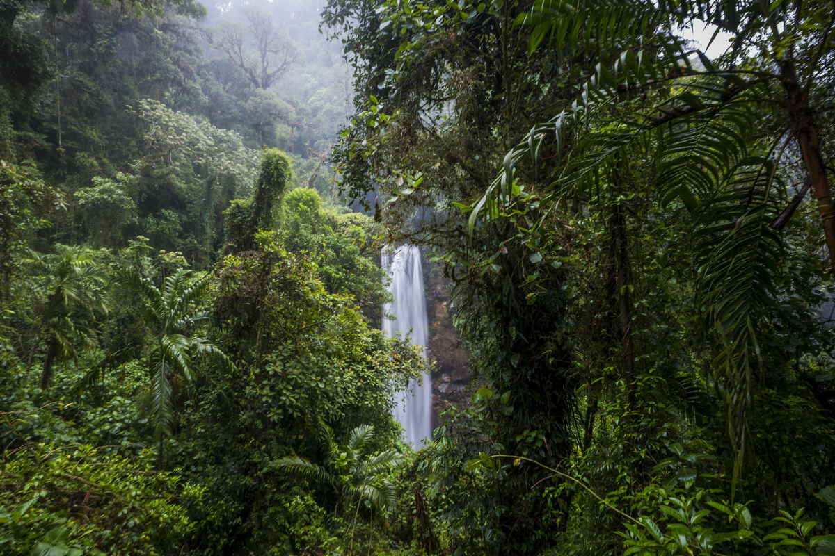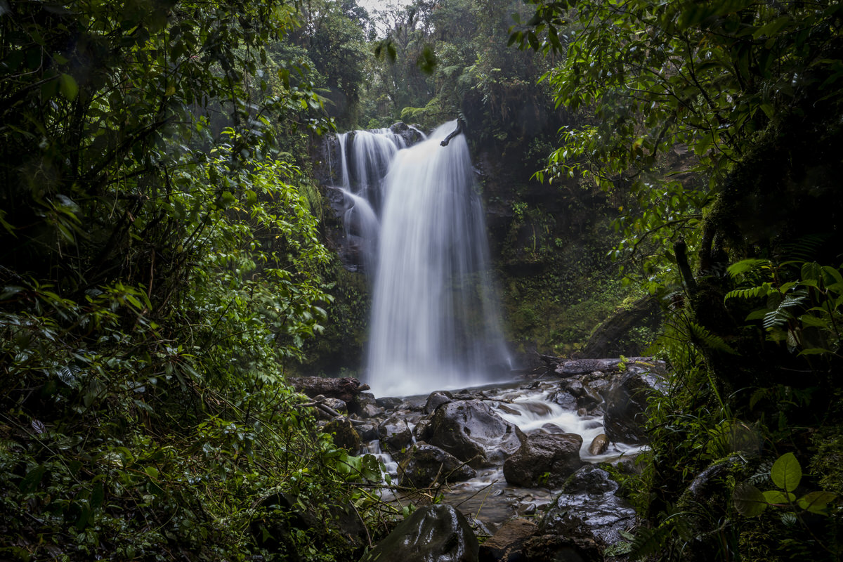 Sinds we bij waterval 3 aan zijn gekomen regent het en het pad wordt daardoor steeds meer blubberig. Gooijert zijn schoenen zijn niet waterdicht, de mijne wel, maar we zitten inmiddels wel aardig onder de modder. Waterval 1 is een uitdaging om te fotograferen door het opspattende water van de waterval maar ook door de regen. De mooiste foto is toch vanaf een afstandje en niet dichtbij de waterval.