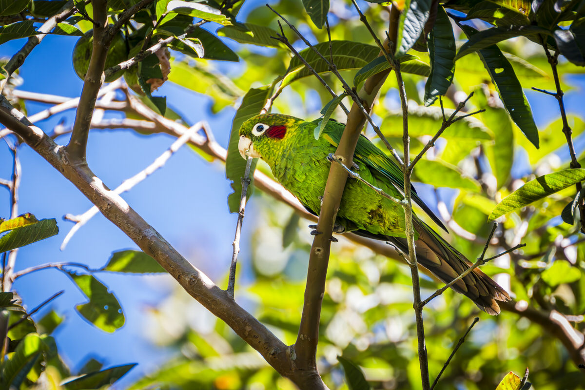 Ook zien we nog papegaaien die zich tegoed doen aan het fruit in de bomen.