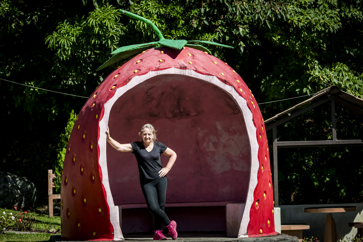Om half 2 is de toer afgelopen, iets langer als normaal. Wat was het gaaf! We drinken nog een ijskoffie en frappé bij Kotowa en bij ons appartement proosten we op weer een zeer geslaagde dag. Snel halen we nog even ontbijt voor morgenochtend en ik koop aardbeien, want in Boquete worden ook aardbeien gekweekt, die moet ik proeven! Nou dat had ik beter niet kunnen doen, haha. Ze zijn hard en niet heel erg lekker. Bij de bushalte in de vorm van een aardbei maken we nog even snel een foto.