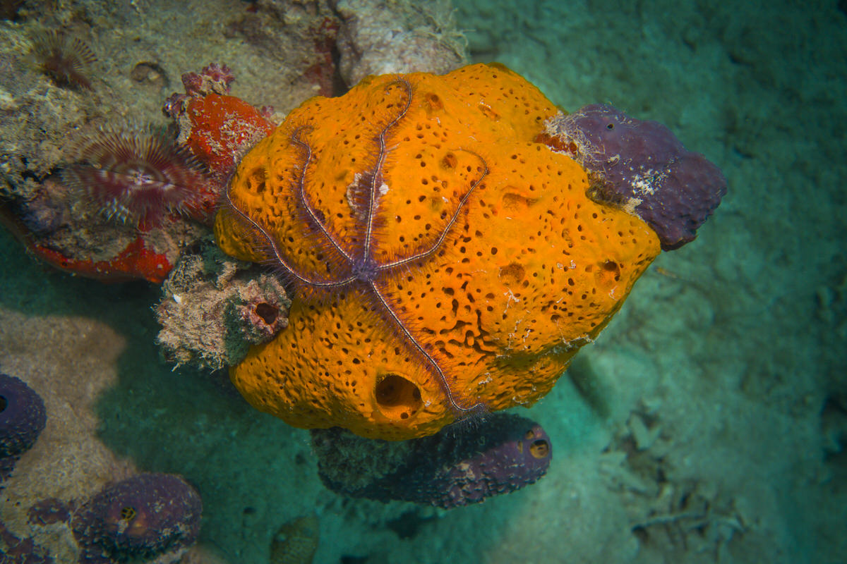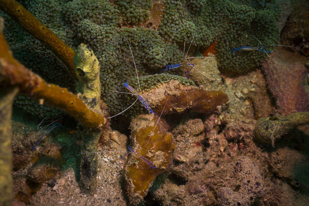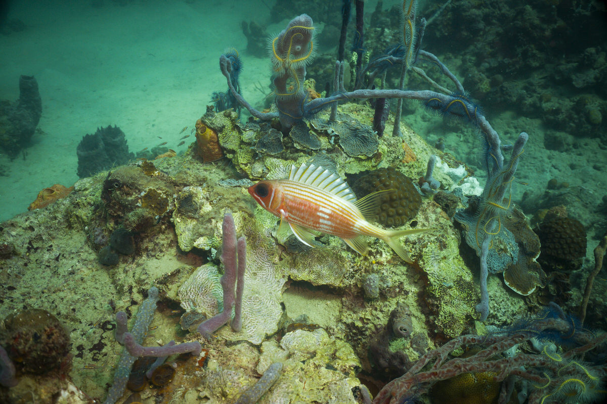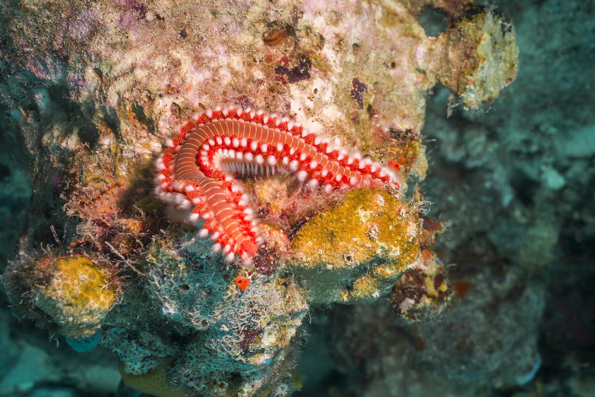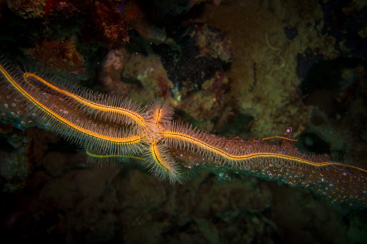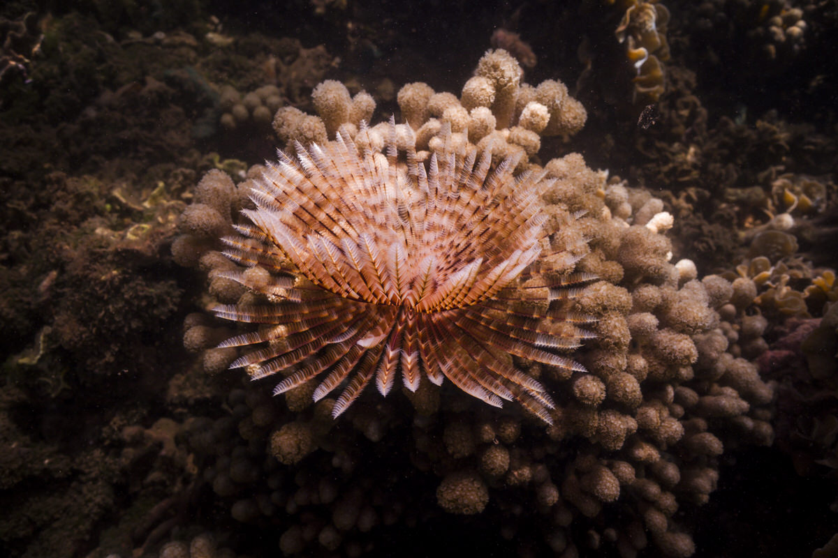 Naast de zeesterren zien we nog een baracuda voorbij zwemmen en ook is hier koraal te vinden met kokerwormen.