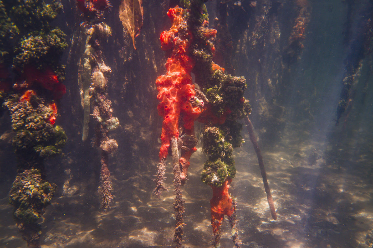 Gooijert is niet heel enthousiast over het snorkelen, precies zoals ik had verteld. Duiken is hier veel mooier om te doen dan snorkelen. De wortels van de mangrove zijn begroeit dat is prachtig om te zien.