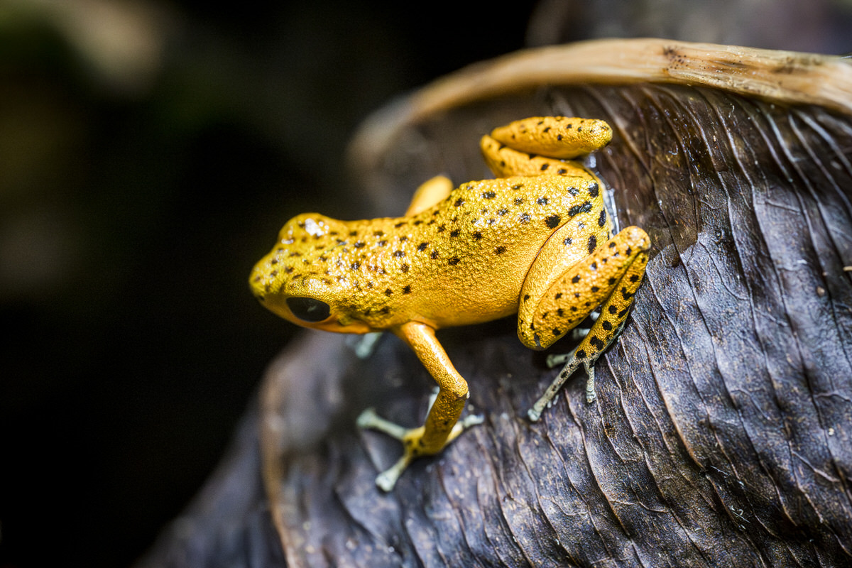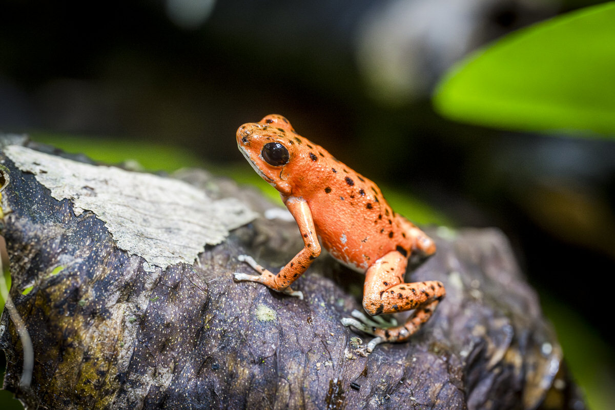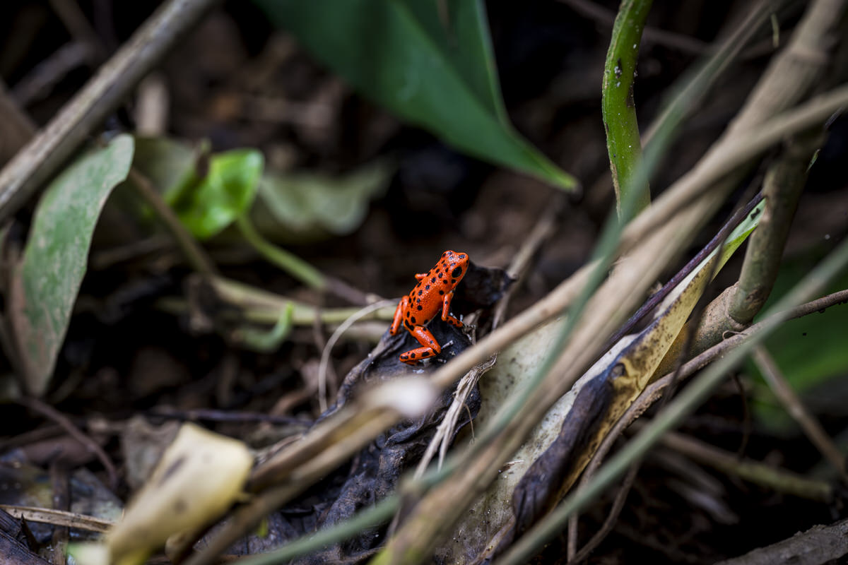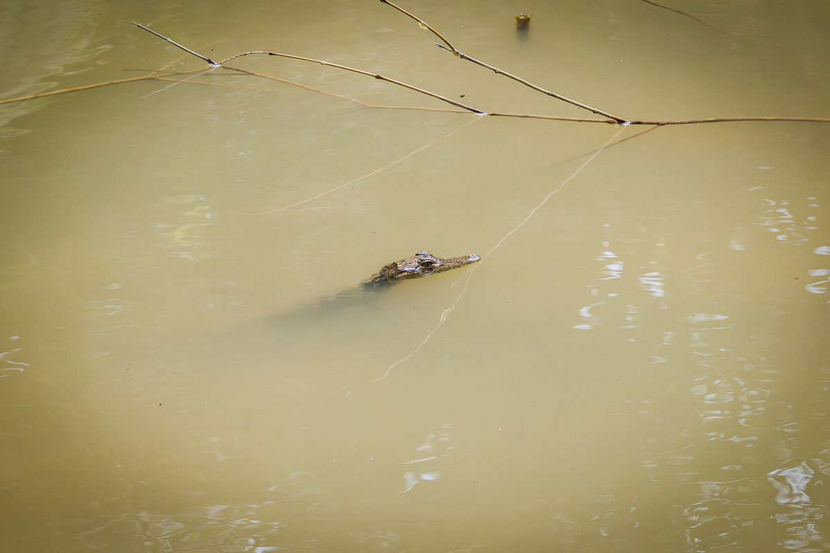 Vet zeg, dan spot ik er ook een paar, maar Gooijert ziet ze beter dan ik. We zien oranje, rode en gele kikkertjes. Ze zijn 1 à 1,5 cm groot deze pijlgifkikkertjes. Ik fotografeer erop los en Gooijert ziet nog een gele, als ik zie probeer te fotograferen wordt ik keihard gebeten door een mier in mijn kleine teen. Geen grap, ik gil van de pijn en besluit dat ik genoeg foto’s heb. De muggen nog tot daar aan toe maar als mieren je gaan bijten is het niet leuk meer. Op de terug weg zien we nog de white face monkey’s en nu zien we in de kaaimanplas, 3 kleine kaaimannen liggen.